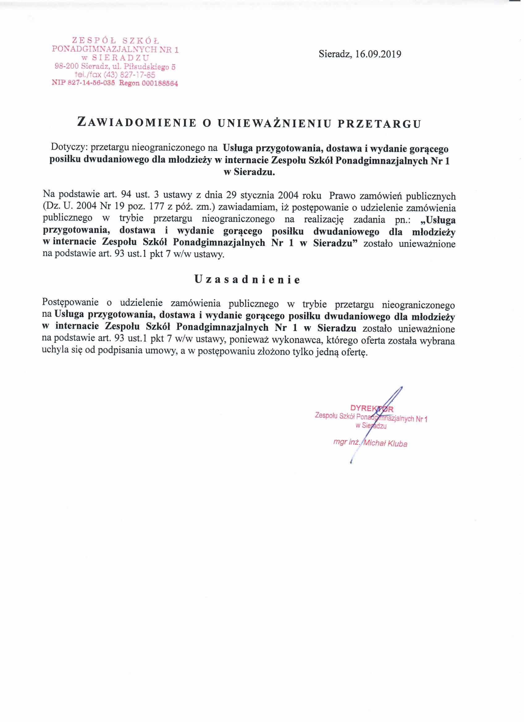 NA” USŁUGĘ PRZYGOTOWANIA, DOSTAWĘ I WYDANIE GORĄCEGO POSIŁKU DWUDANIOWEGO” DLA MŁODZIEŻY MIESZKAJĄCEJ W INTERNACIE ZESPOŁU SZKÓŁ PONADGIMNAZJALNYCH NR 1 W SIERADZU
